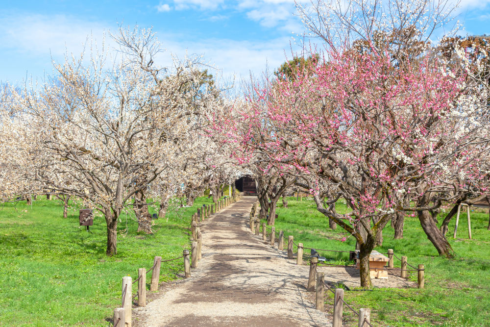 Kairaku-en is most famous for its plum trees. Over 3,000 plum trees representing around 100 varieties bloom here from late February to March, filling the air with a subtle fragrance. Unlike cherry blossom viewing, plum blossom season is quieter and more contemplative, making it ideal for unhurried walks. Outside of spring, the garden remains appealing with bamboo groves, cedar forests, and open lawns that frame views of the city below.
