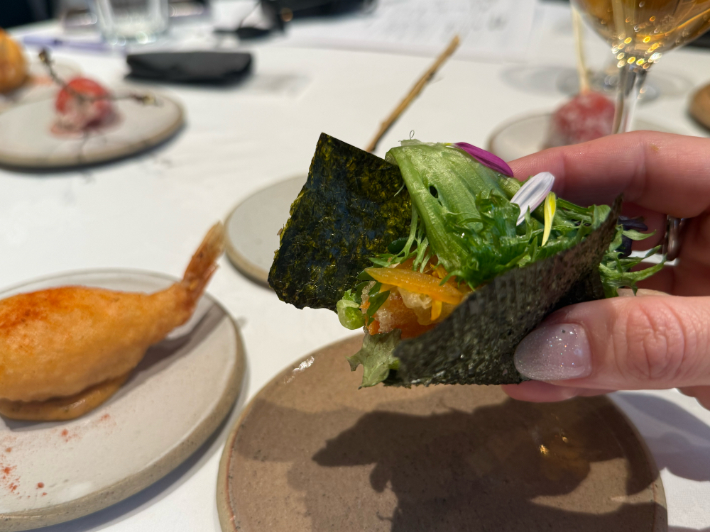 - Seasonal vegetable tempura “taco style” (yes, you eat it with your hands, and it was my favorite to be honest!)